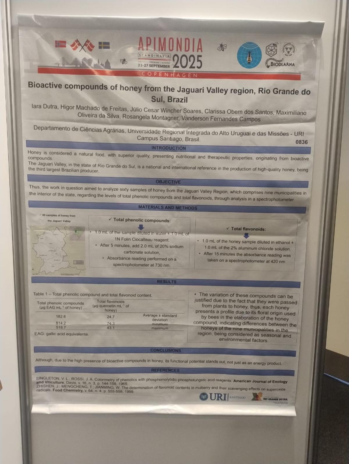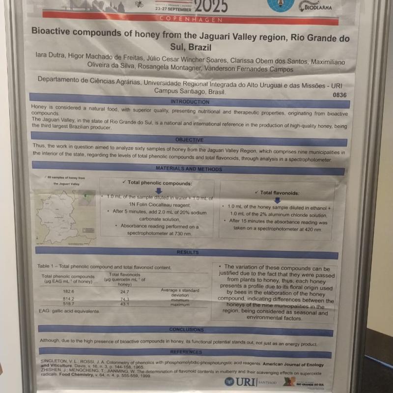 Entre os dias 23 e 27 de setembro, Copenhagen, na Dinamarca, sedia o 49th APIMONDIA Congress, um dos mais importantes eventos internacionais de apicultura. A Universidade Regional Integrada do Alto Uruguai e das Missões (URI) Câmpus de Santiago marca presença com o trabalho "Bioactive compounds of honey from the Jaguari Valley region, Rio Grande do Sul, Brazil", que integra o projeto "Rastreabilidade e Autenticidade do mel do Vale do Jaguari-RS".
