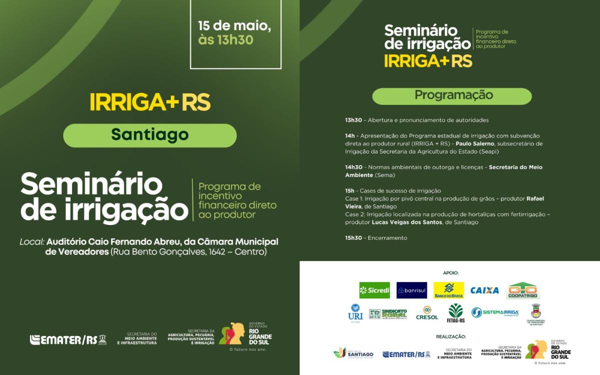 O Governo do Estado do Rio Grande do Sul, através da Secretaria da Agricultura, Pecuária, Produção Sustentável e Irrigação (Seapi), em conjunto com a Emater/RS, Secretaria do Meio Ambiente e Infraestrutura (Sema) e Prefeitura de Santiago, promove na próxima, quinta-feira (15), de maio o Seminário de Irrigação IRRIGA+RS.