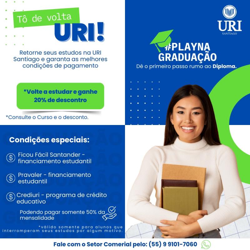Com intuito de auxiliar os estudantes na permanência em suas graduações, a Universidade Regional Integrada do Alto Uruguai e das Missões (URI), Câmpus de Santiago, lançou a campanha “Tô de Volta URI”. Oportunizando 20% de desconto no momento da matrícula, a campanha apresenta inúmeras possibilidades de financiamento/crédito estudantil.