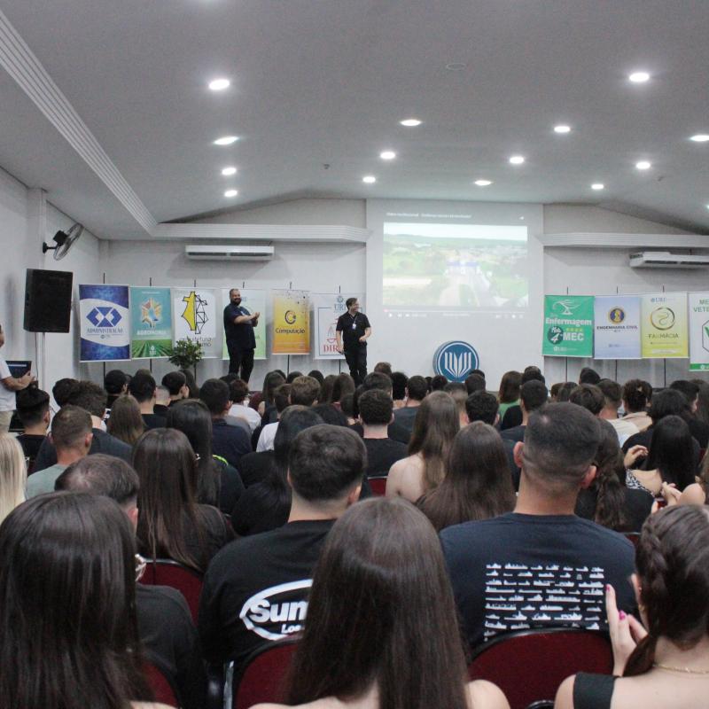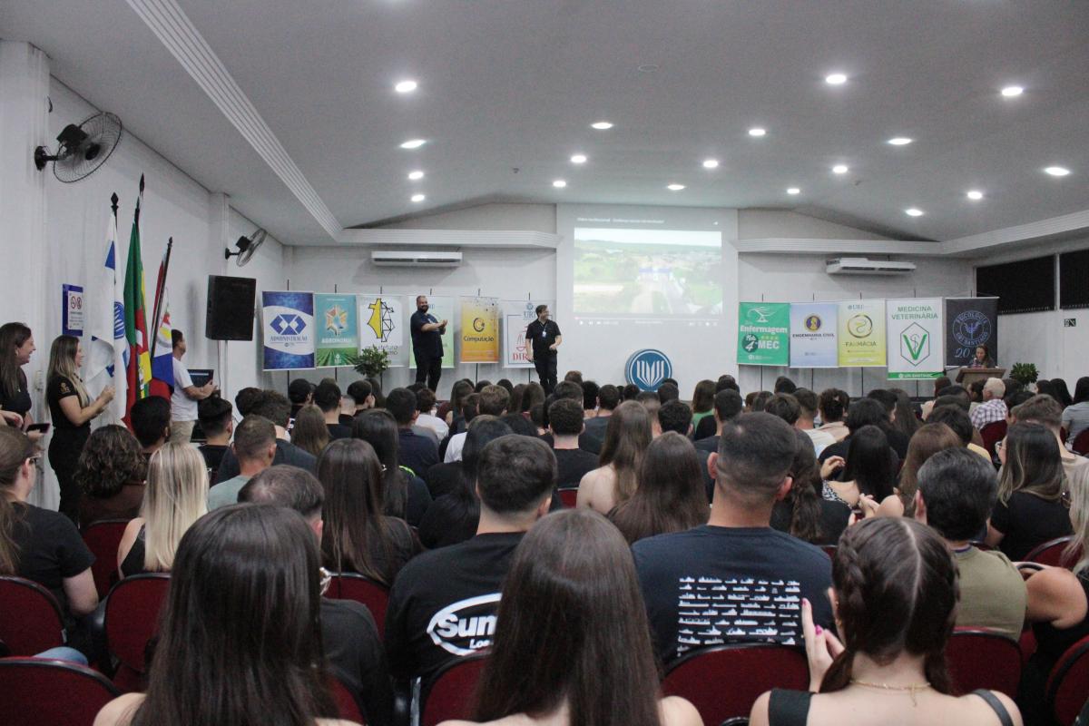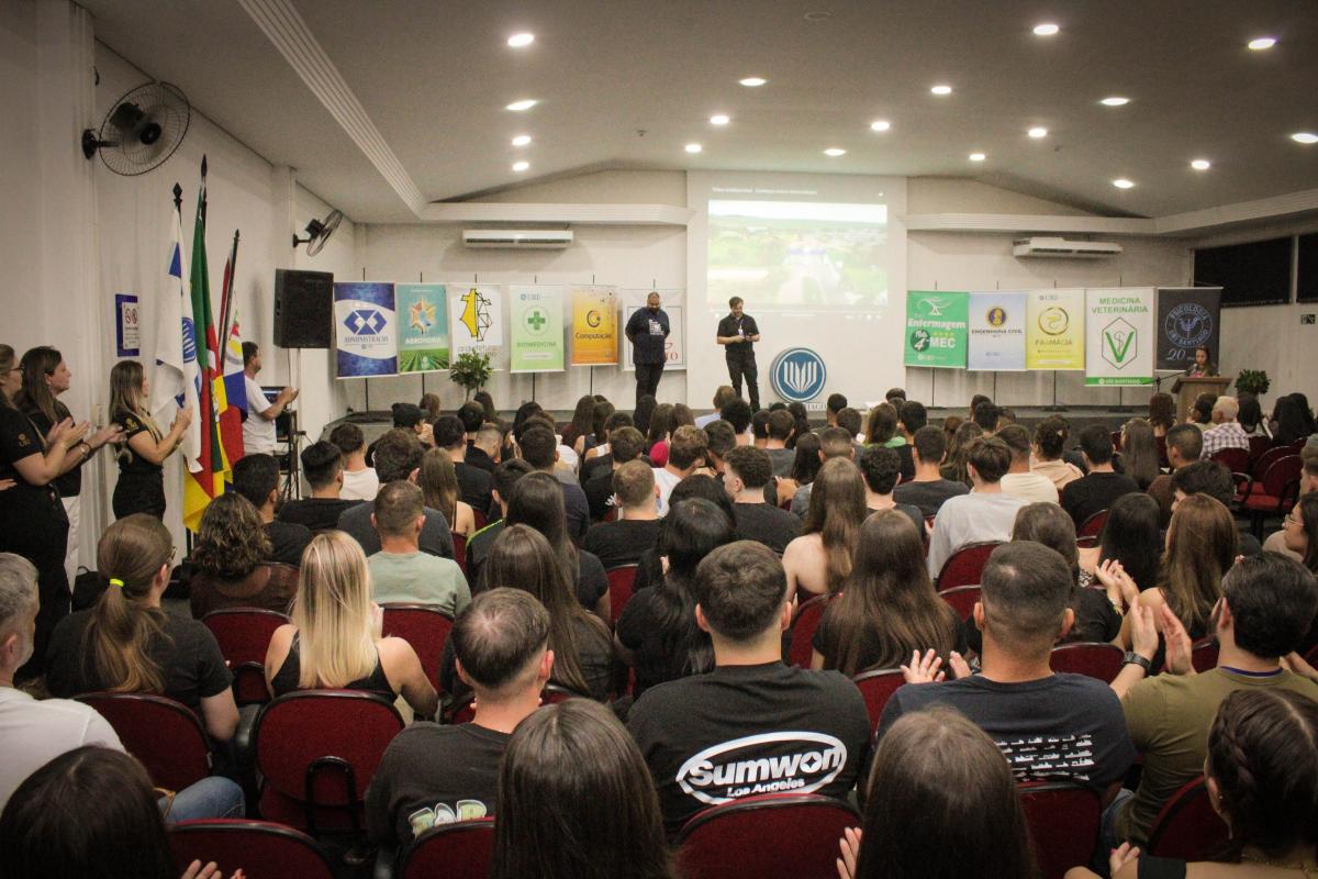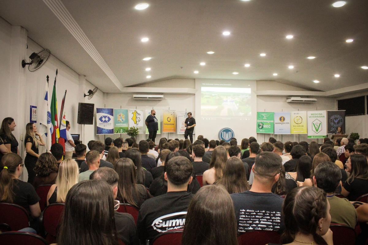 A segunda-feira (24), foi marcada por um momento de acolhimento e integração na Universidade Regional Integrada do Alto Uruguai e das Missões (URI) Câmpus de Santiago, com uma recepção aos estudantes, em especial os calouros, que iniciam sua jornada acadêmica no 1º semestre de 2025. O evento, realizado no Salão de Atos da Instituição, contou com a presença de mais de 300 pessoas entre acadêmicos, professores e colaboradores.