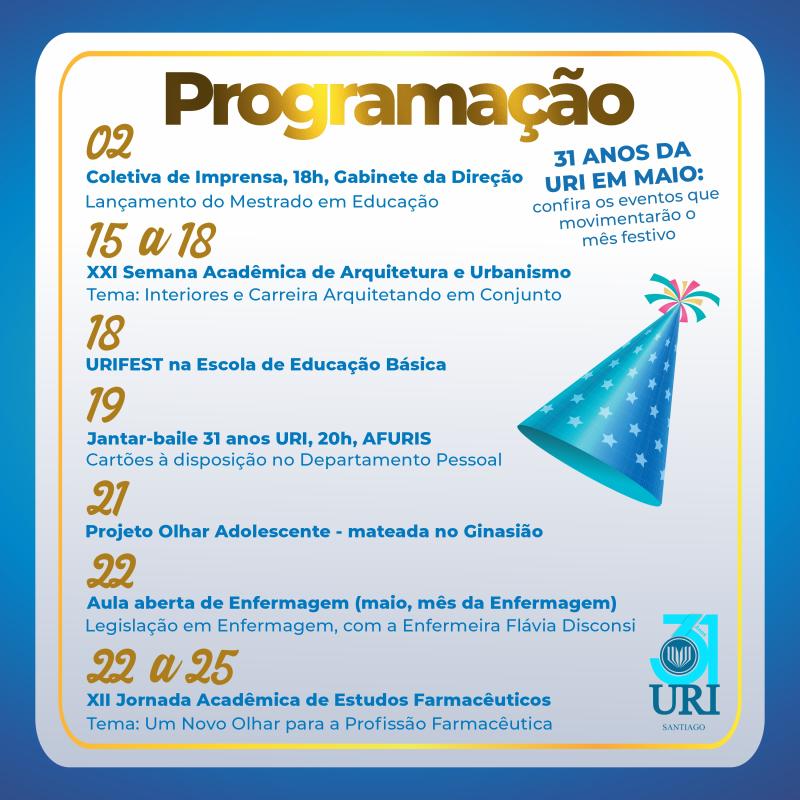 A Escola realizará seu URIFEST no dia 18. No feriado do dia 19 de maio, haverá jantar-baile na AFURIS, com homenagens e música ao vivo. O Projeto Olhar Adolescente estará em mateada no ginasião no dia 21. Ocorrerão oficinas de grafite e arte, apresentações artísticas e campanha do agasalho. Ao doar agasalhos, o participante ganhará uma muda de árvore frutífera do curso de Agronomia.