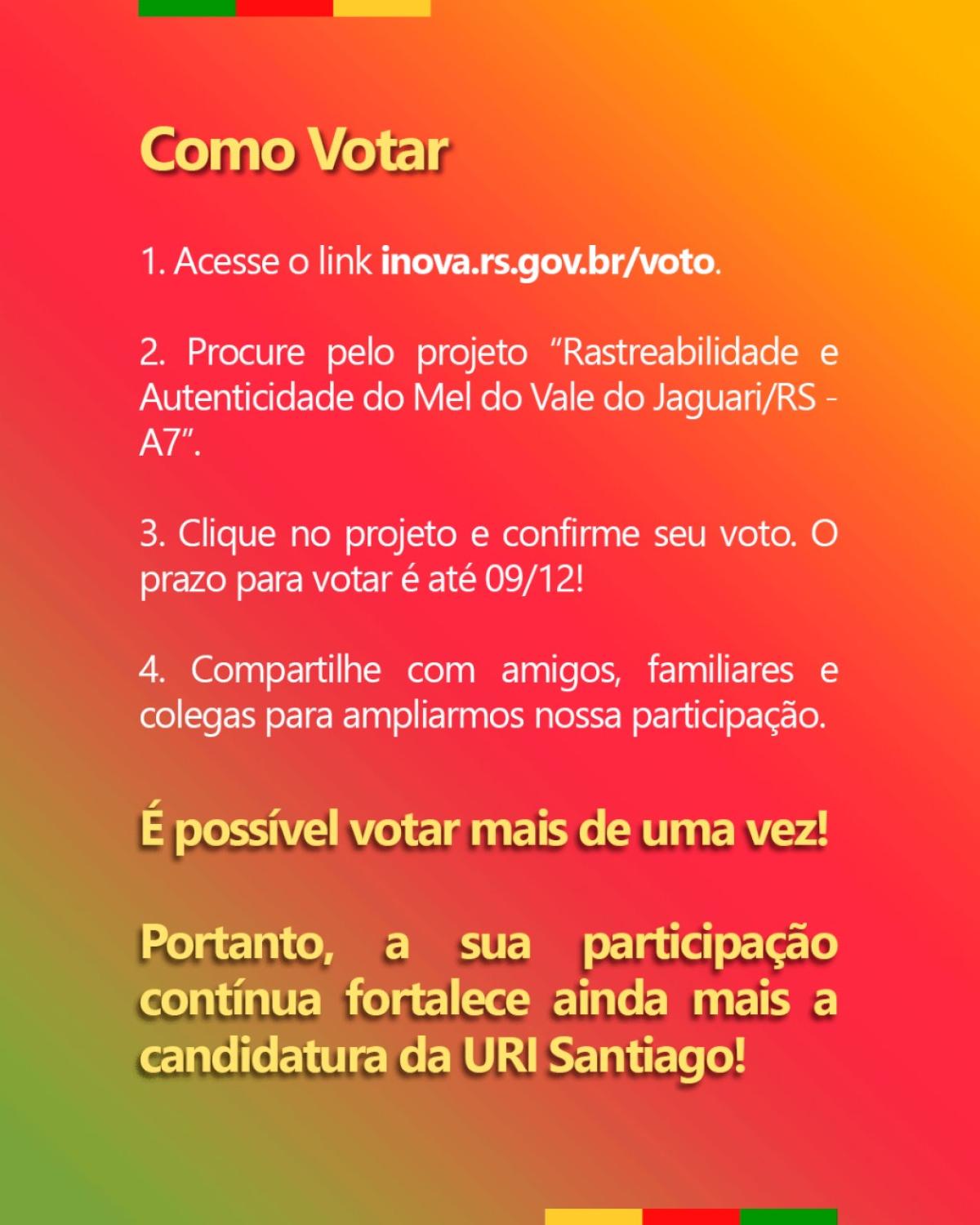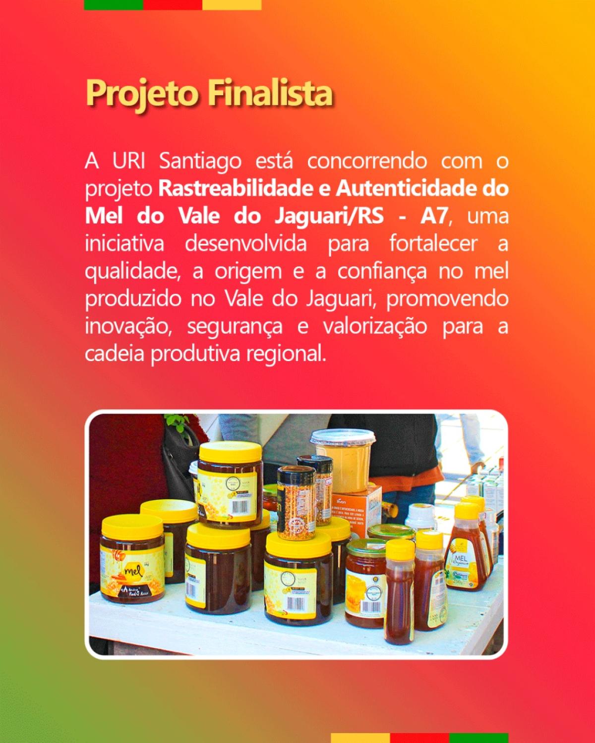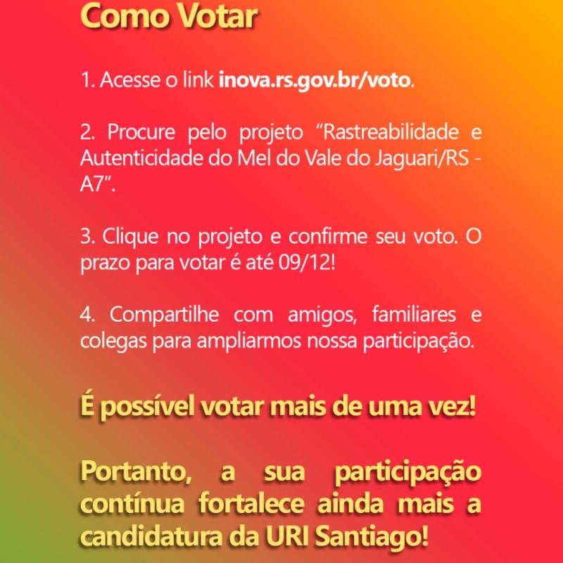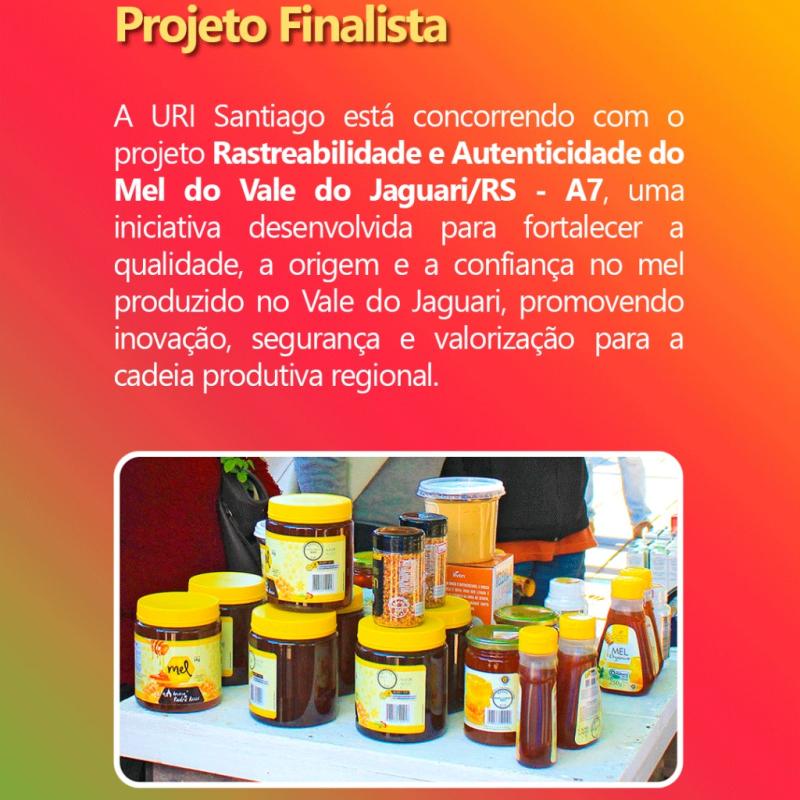 Procure pelo projeto A7 – Rastreabilidade e Autenticidade do Mel do Vale do Jaguari/RS, confirme seu voto e compartilhe.