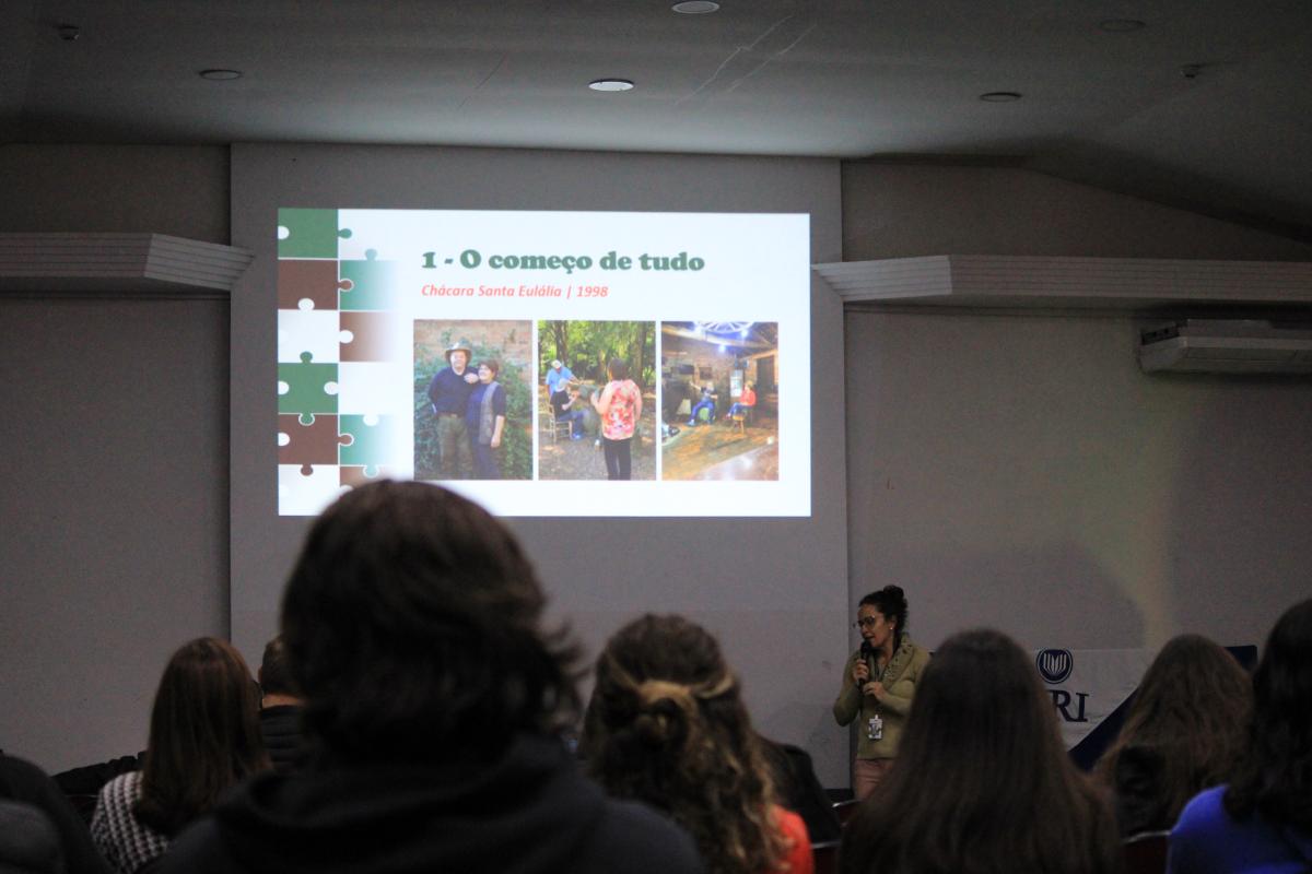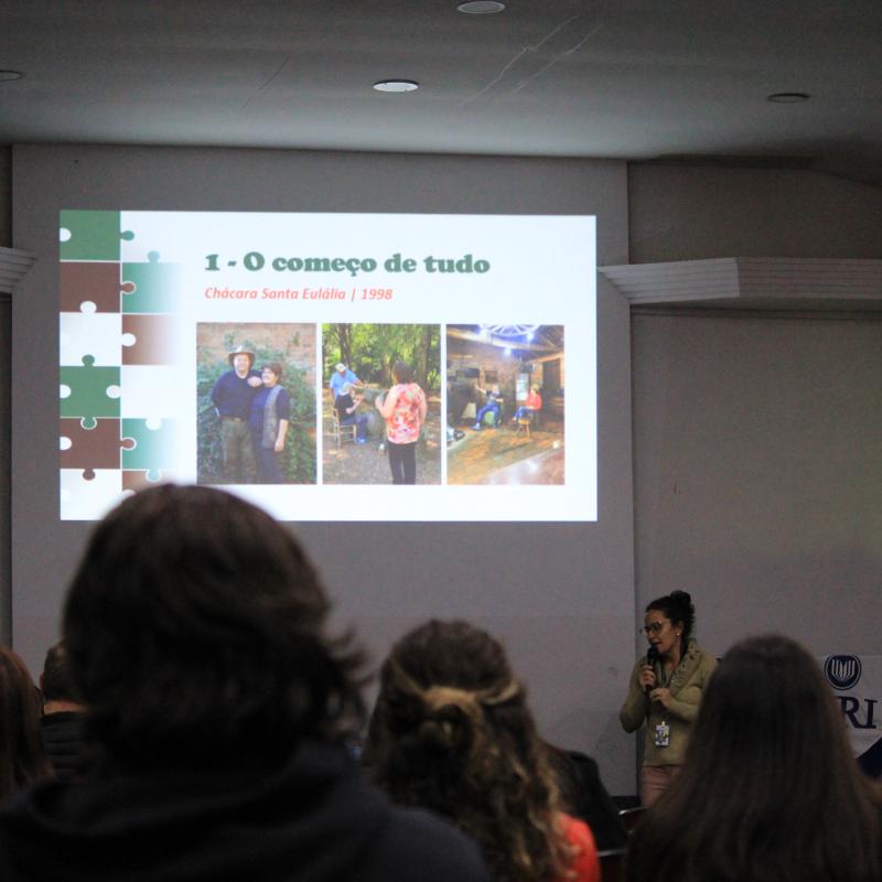 Realizada no Salão de Atos da Universidade, a palestra trouxe reflexões sobre o cuidado, o envelhecimento da população e o papel do empreendedorismo com afeto. Natural de Silveira Martins (RS), Giovanna é fundadora do DOLCE VITA – Centro Especializado em Cuidado ao Idoso, referência nacional em assistência geriátrica. Também criou a startup @comocuidaridoso e lidera iniciativas que integram memória afetiva, turismo e valorização dos vínculos comunitários.
