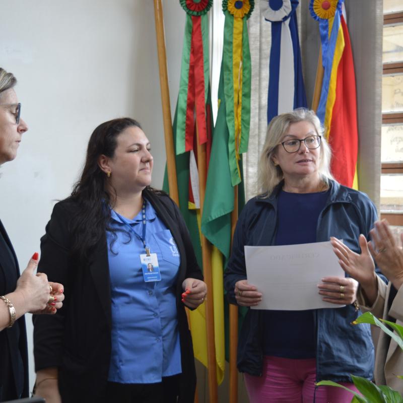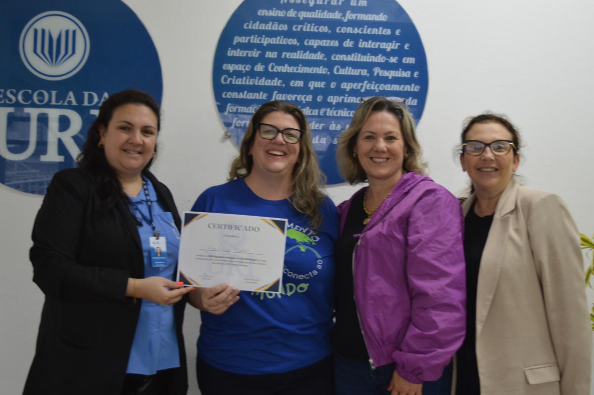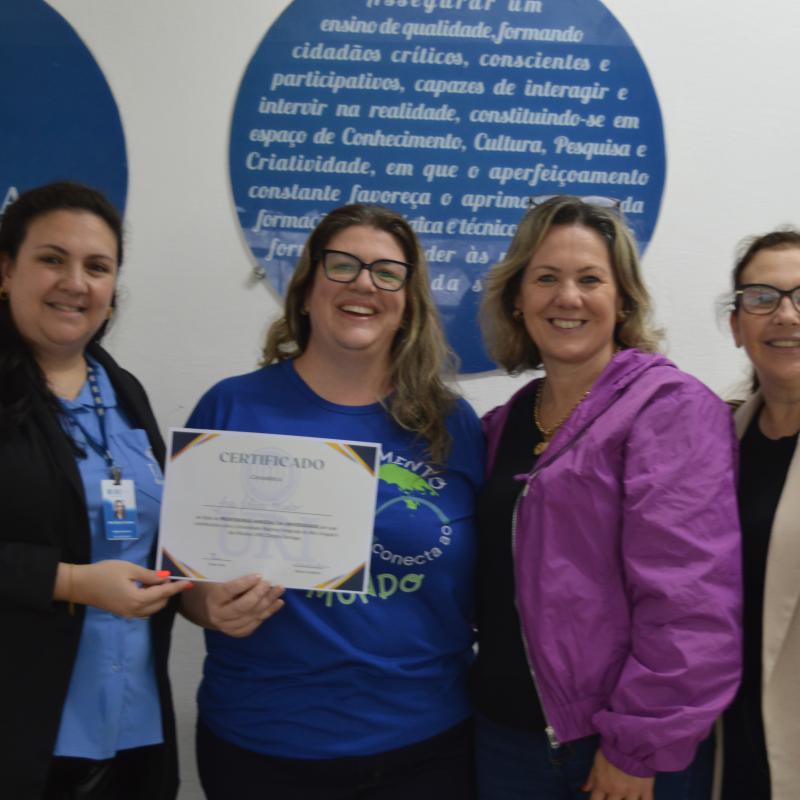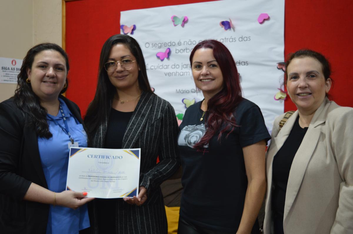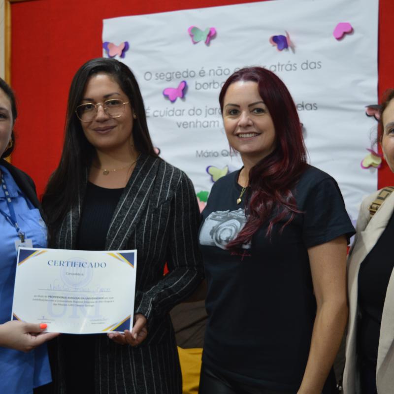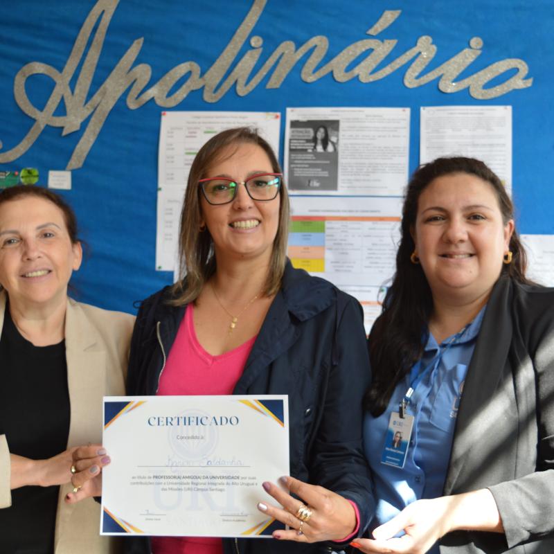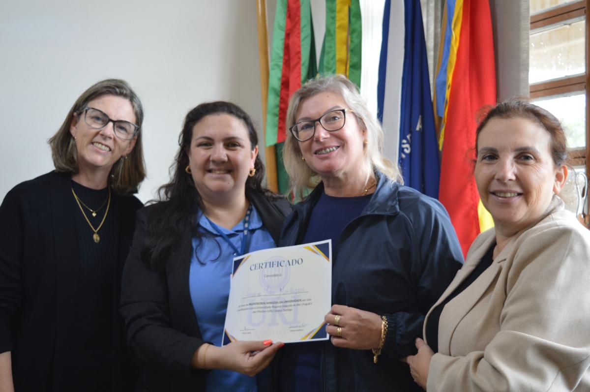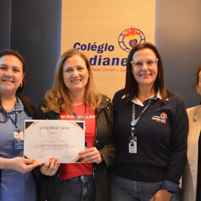 Visando aproximar as Escolas de Santiago ao ambiente acadêmico, a Universidade Regional Integrada do Alto Uruguai e das Missões (URI) Câmpus de Santiago, realizou a entrega oficial do certificado que nomeia representantes de Escolas de Ensino Médio, públicas e privadas, ao cargo de “Amigo(a) da URI”. A proposta compõem o cronograma de ações do Vestibular de Verão 2025 e foi entregue pela Diretora Acadêmica, Professora Adriana Irion e pela coordenadora do Vestibular, Aline Carlosso.