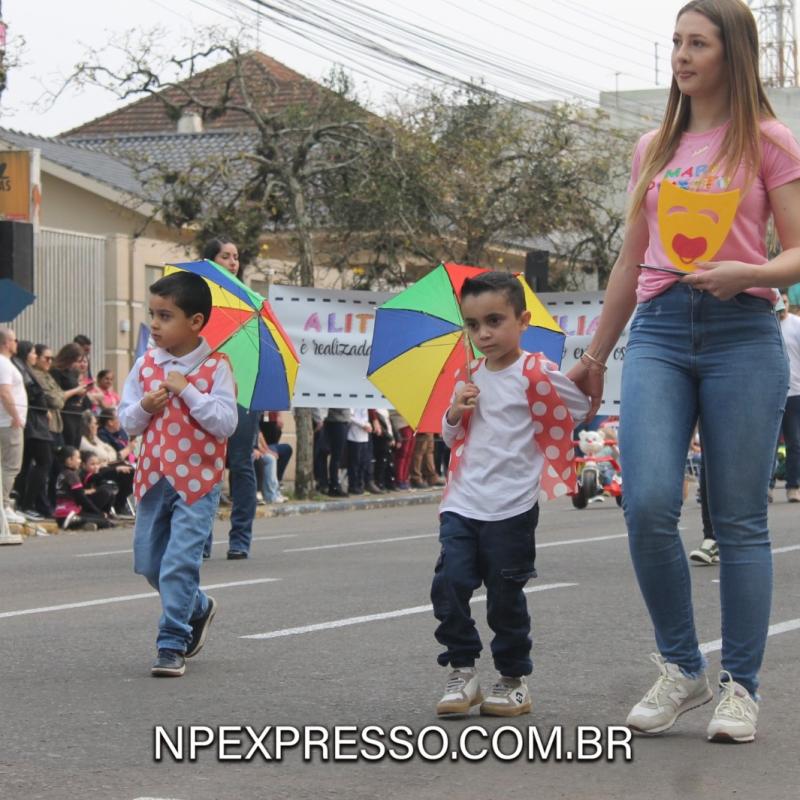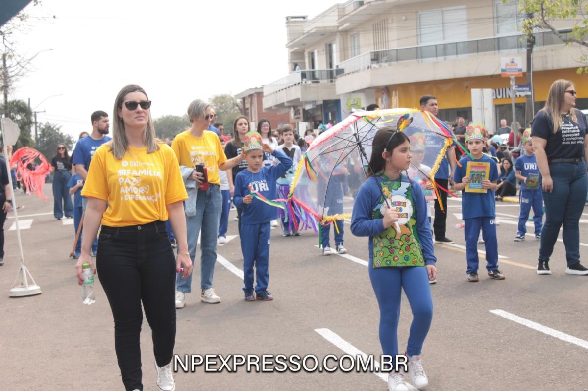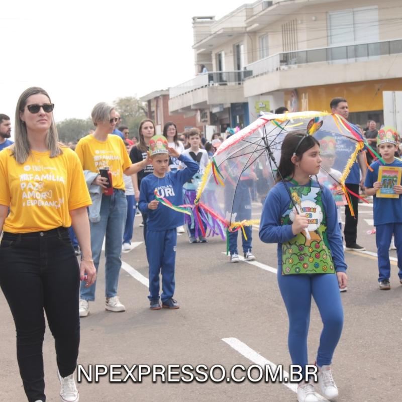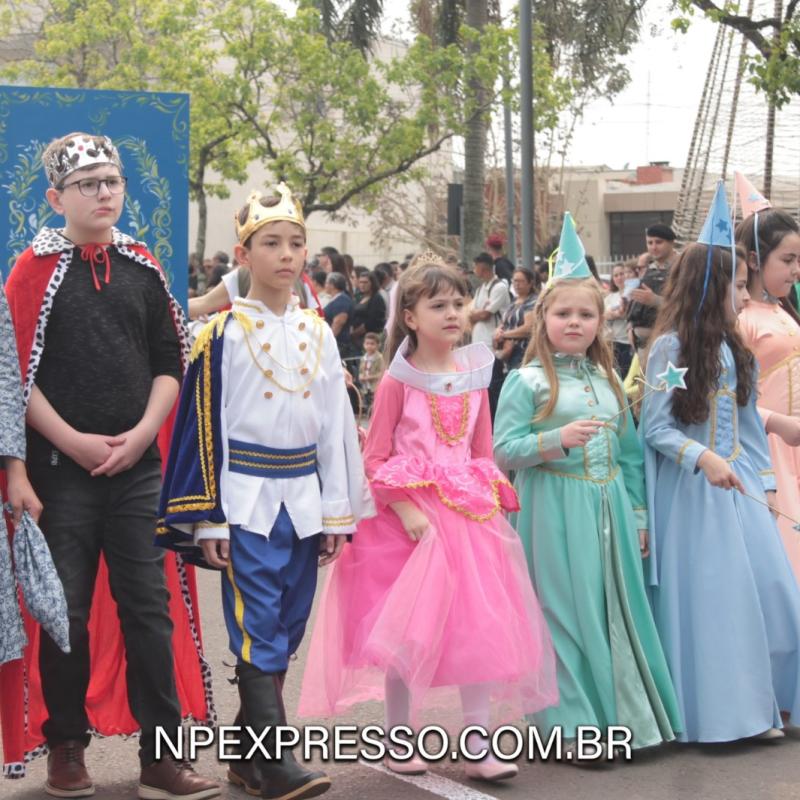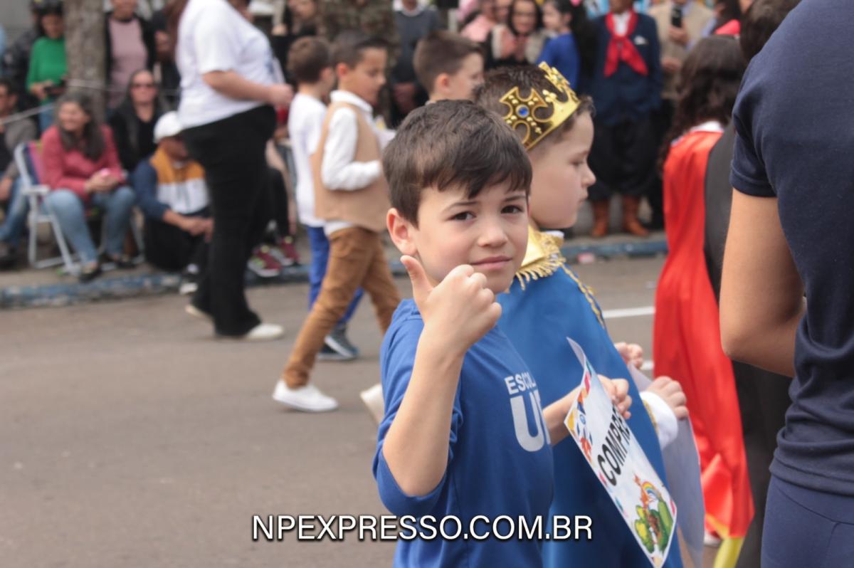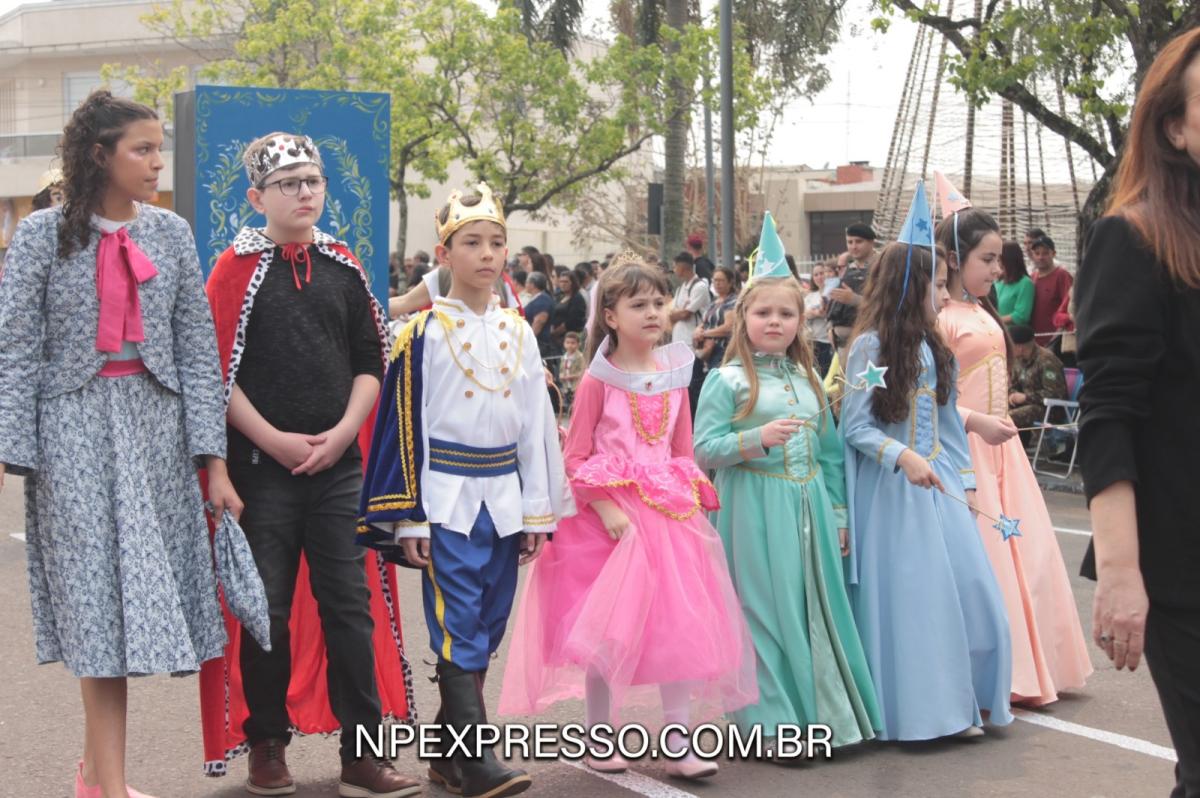 Na sequência, retratando a cultura e a literatura, os alunos da Escola de Educação Básica da URI, fantasiados de personagens, encantaram a todos com uma apresentação. Ainda enfatizando a temática, foi apresentado um pelotão de estudantes dos anos iniciais e do ensino fundamental, acompanhados de seus pais e familiares.