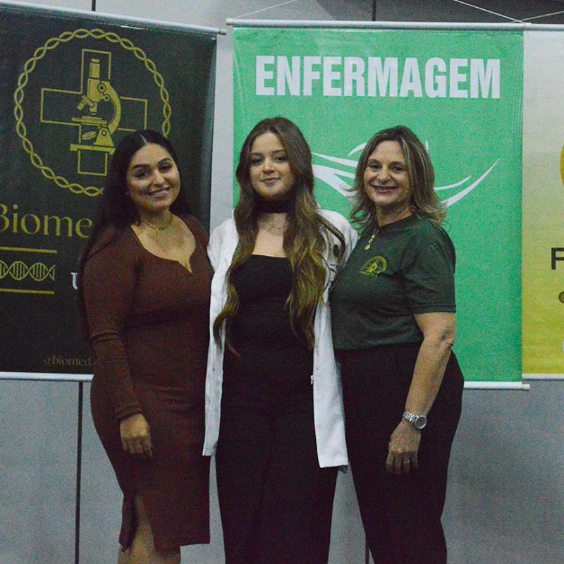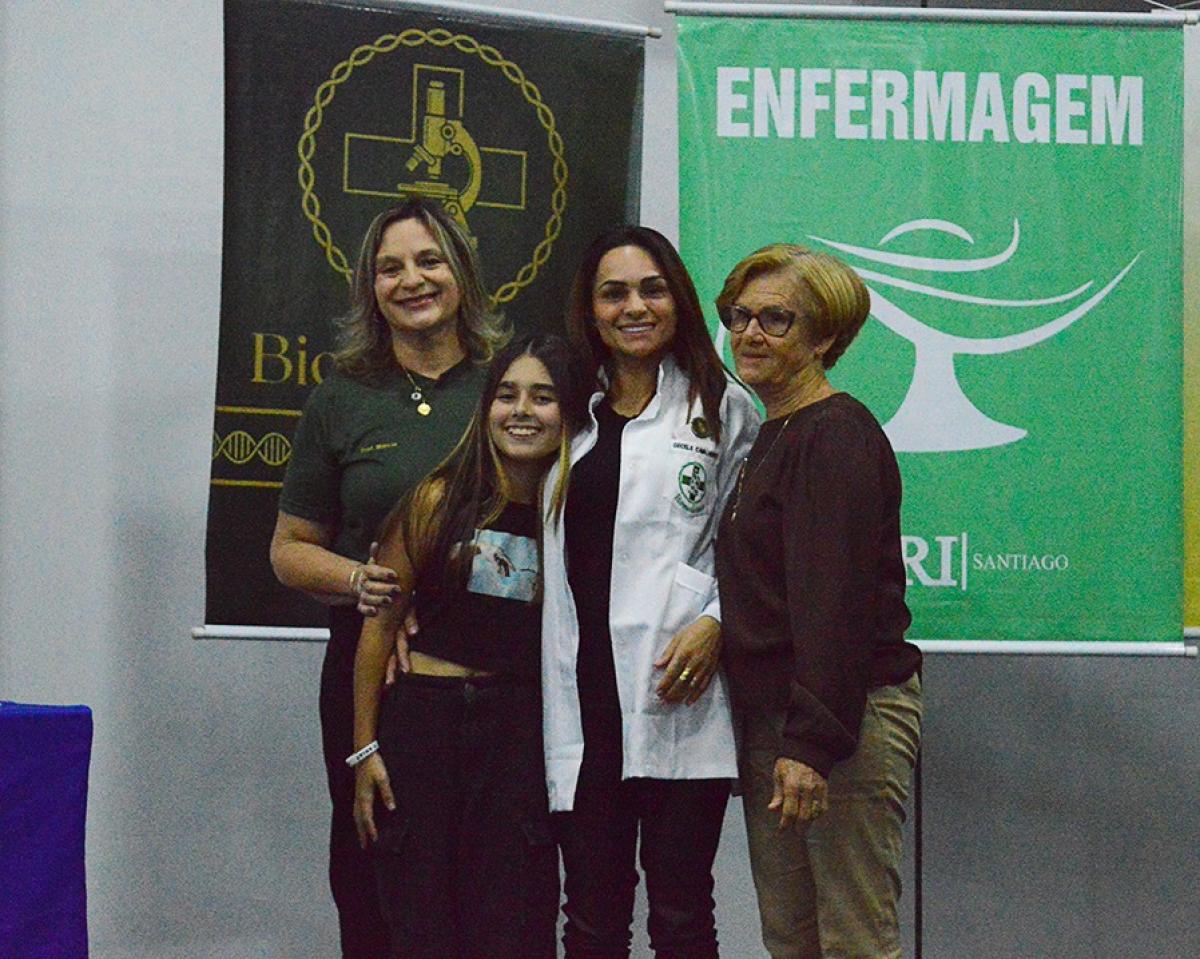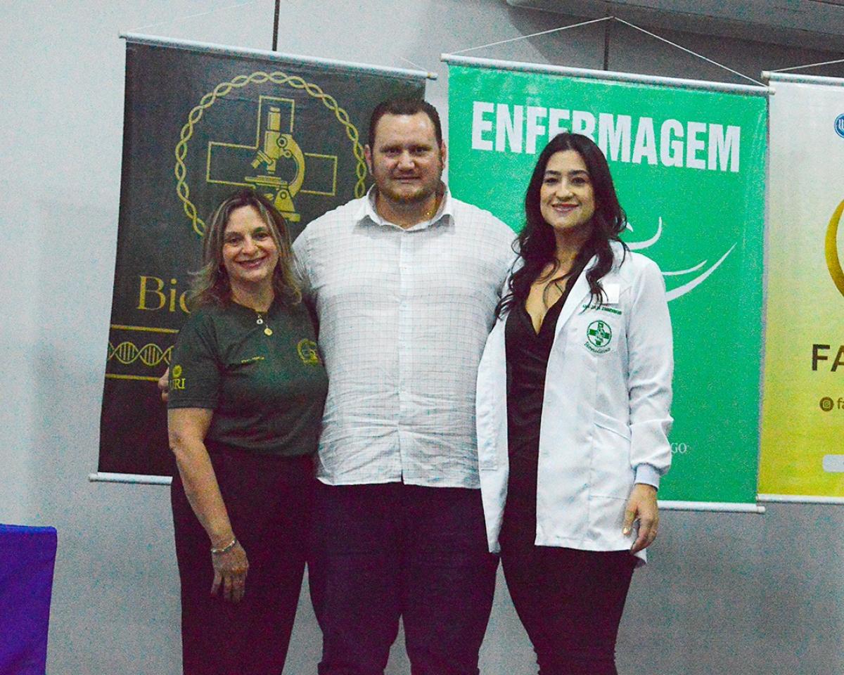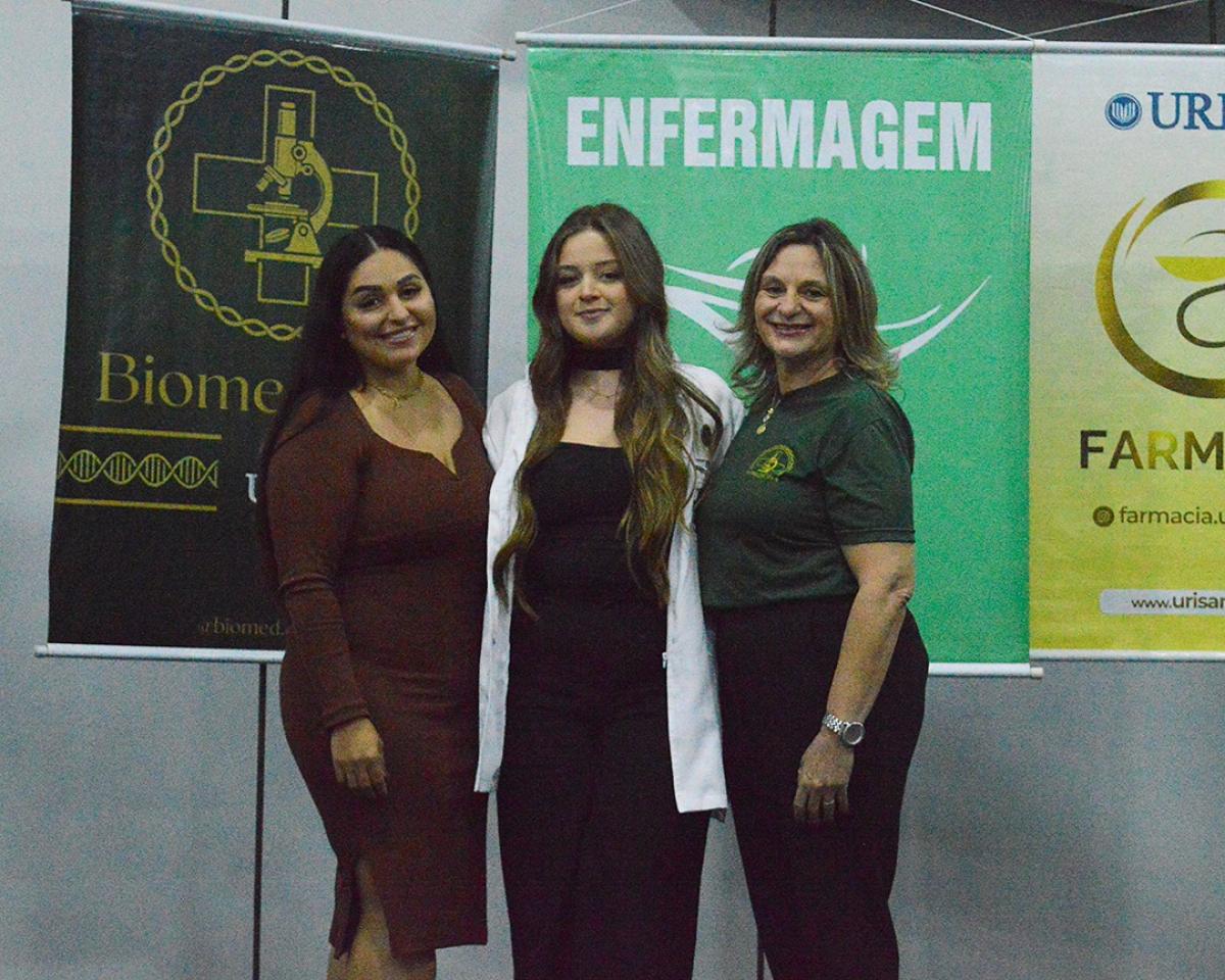 Outro momento de destaque foi o juramento, conduzido por representantes dos cursos: Maria Eduarda Brum Cruz, de Biomedicina; Vanessa da Silva Diniz, de Enfermagem; Diulia Cortes Pinheiro, de Farmácia; e Amanda Merlugo Kratzig, de Fonoaudiologia, que reafirmaram o compromisso dos acadêmicos com a ética profissional e o cuidado com o ser humano.
