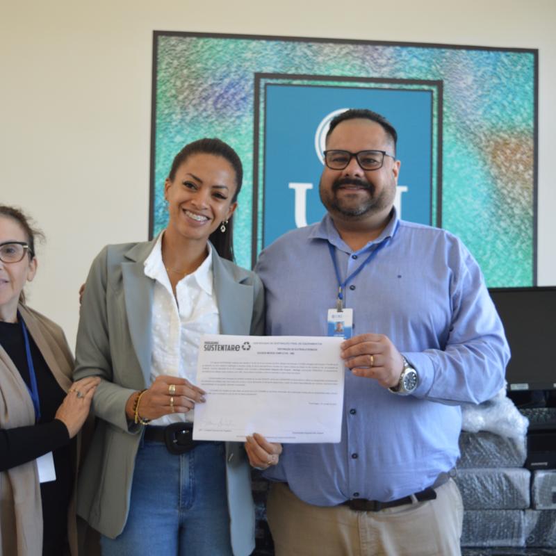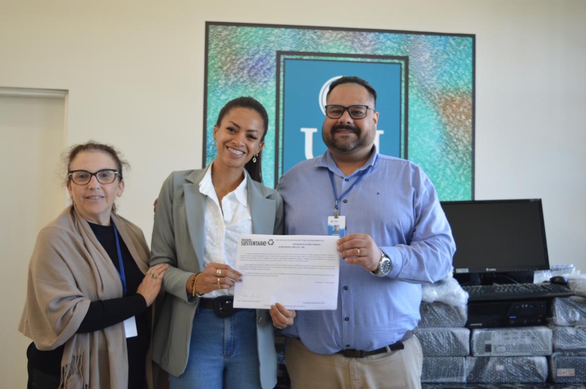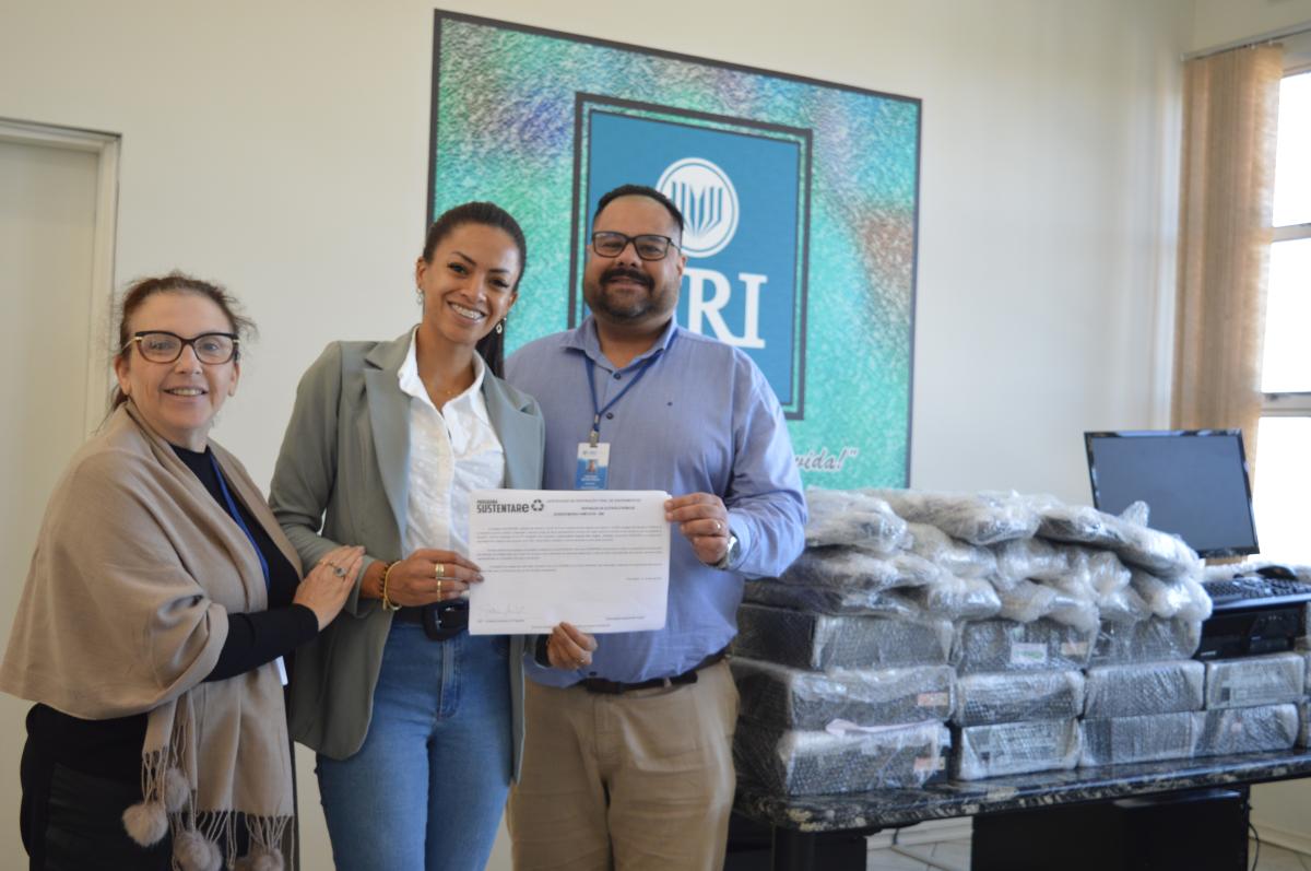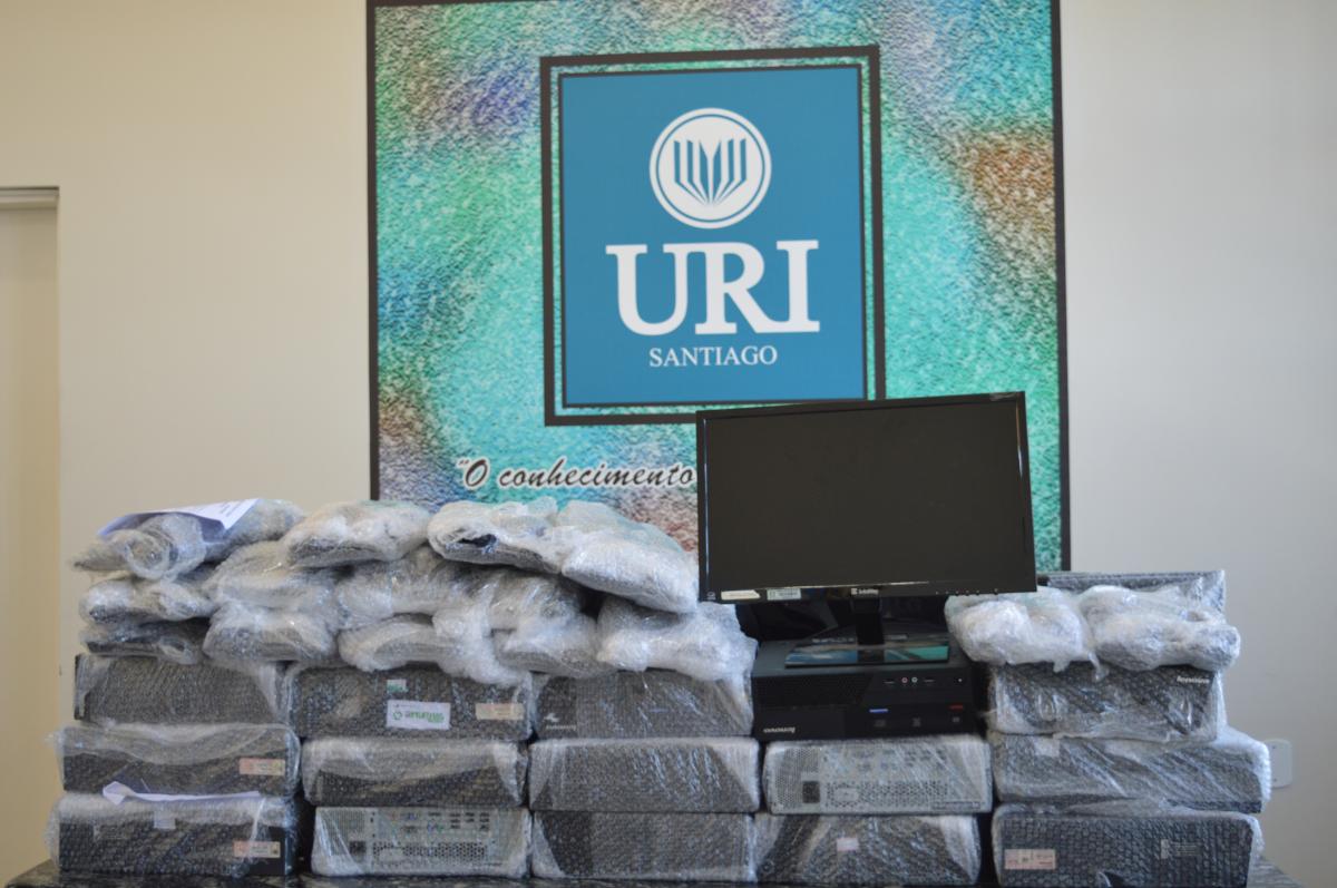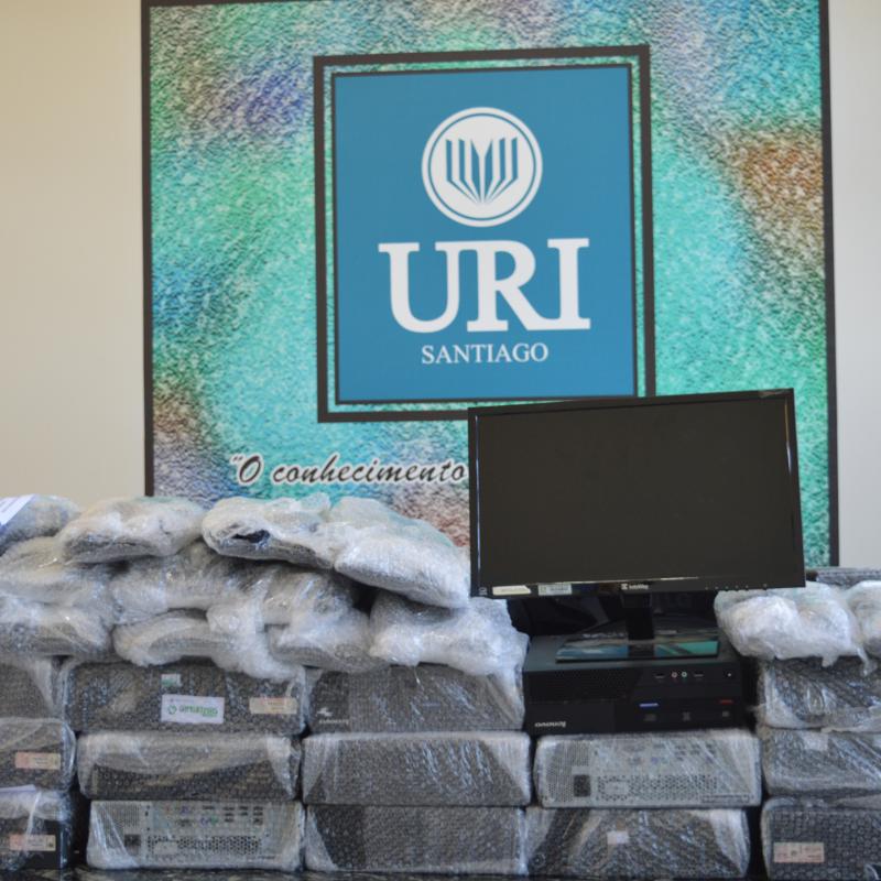 Na manhã desta quarta-feira (17), a Universidade Regional Integrada do Alto Uruguai e das Missões (URI), Câmpus de Santiago, recebeu 15 computadores do Programa Sustentare - programa de destinação e descarte de ativos eletrônicos de órgãos e entidades -, do Governo do Estado. A entrega foi realizada pela Executiva Estadual e egressa da Instituição, Mileny Velasco, no gabinete do Diretor Geral.